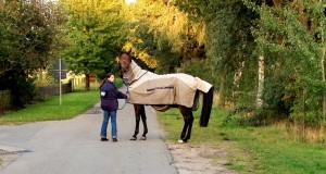 Das trifft den Spaziergang sehr gut: Zuerst vom Hof gestürmt und mehrfach von rechts nach links springend begonnen und dann ruhig weiter gegangen. Ich habe heute die Hanffüllung erneut gewechselt. Der Strahl sieht in Ordnung aus. Bis in die Zehe konnte ich trotz Taschenlampe leider nicht sehen, aber mit dem Hufkratzer habe ich doch Dreck zu Tage gefördert… Es könnte auch abgestorbenes Horn gewesen sein. Jedenfalls hab ich mit Markus gesprochen und wir verlegen den Kontrolltermin nach vorn. Anschließend habe ich wieder neues, trockenes Hanf „verstopft“ und den Deckel verschlossen.