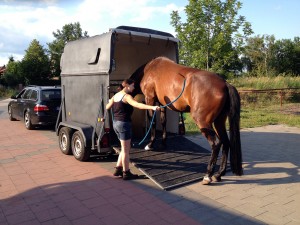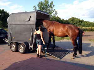 Ach ja und wir haben uns einen Pferdeanhänger geliehen der groß genug für Dina ist. War gar nicht einfach, da alle irgendwie zu klein oder verborgt waren. Dementsprechend vorsichtig ging Dina mit dem Hänger um. Die „übliche“ Vergehensweise hat nicht ganz so gut geklappt bzw. hätte einfach zu lang gedauert, also haben wir sie mit Heu überredet in den Anhänger zu gehen. Hat mir nicht gefallen, musste aber sein, da wir einen Termin hatten und in der Klinik auf uns gewartet wurde. Am Anfang hat Galdina dann echt Terror gemacht, so dass ich Angst um den Anhänger bekam. Aber nachdem wir dann fuhren, wurde sie ruhig und hat auch in den Kurven immer besser gestanden. *braves Pferd*