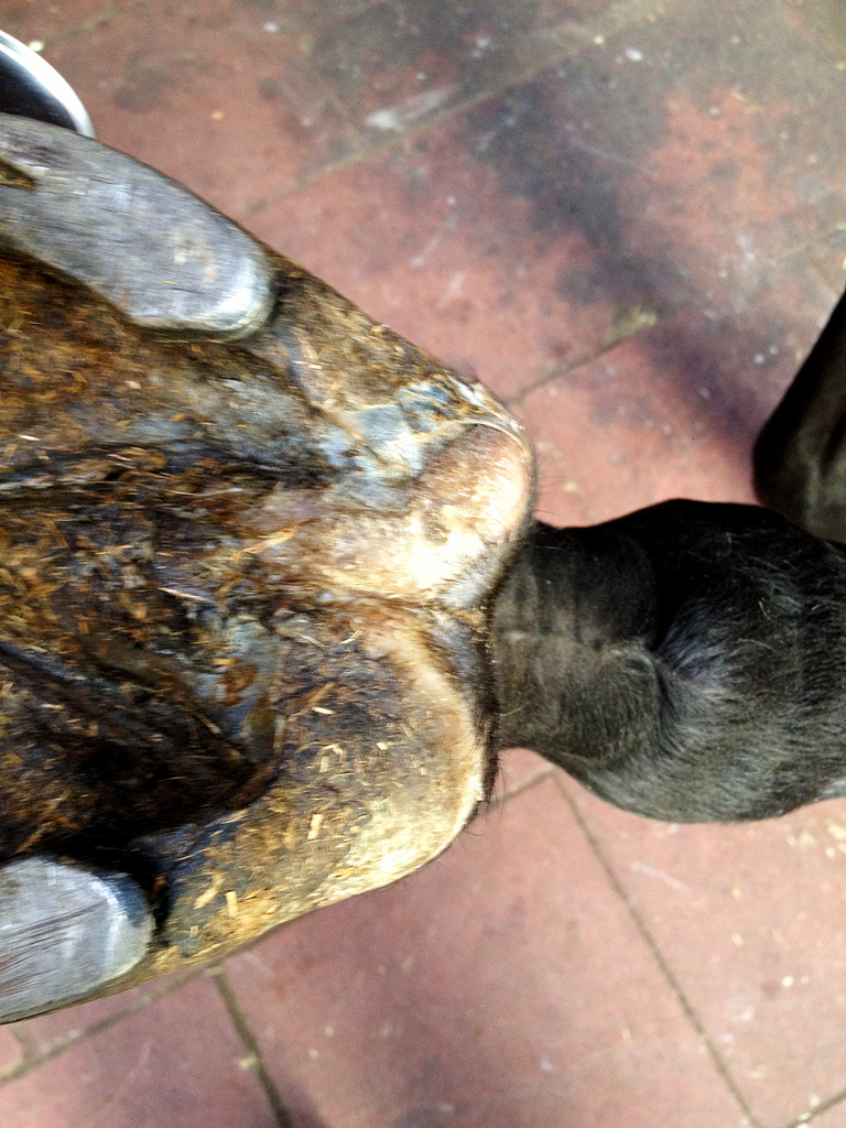 Nach heute Morgen habe ich mit Markus gesprochen, der zwischenzeitlich bei Galdina war und sich den Huf angesehen hat. Sie scheint sich, wie auch immer, wirklich getreten zu haben. Der Ballen ist rosarot (sieht man nicht so gut auf dem Foto) und geschwollen. Außerdem hat Dina beginnende Strahlfäule in der mittleren Strahlfurche, die ich jetzt behandeln soll und werde. Dazu habe ich mir Jodoform-Gel zum Aufpinseln gekauft, damit die Bakterien entfernt und der Strahl wiederaustrocknen und sich regenerieren kann. Galdina ist zurzeit echt richtig mies drauf, die Behandlung ist eine Tortur – für uns beide!