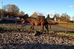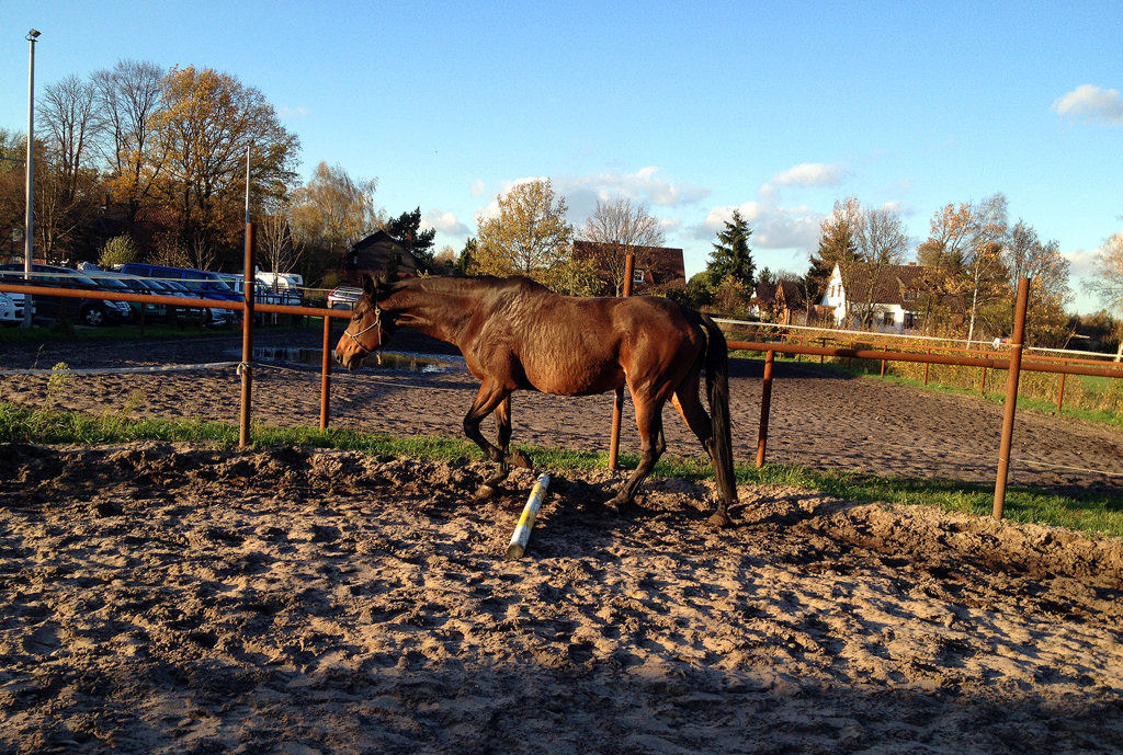 Galdina hatte sich fürchterlich aufgeregt, da ihr Paddock-Begleiter sie allein gelassen hatte. Wie man auf dem Foto erkennen kann, musste sie in der Arbeit erst einmal trocknen. Bei der Arbeit selbst war sie konzentriert und ist kaum über die Stange gefallen. 😉
