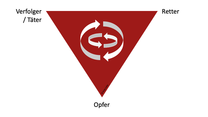 Karpman definiert im Dramadreieck die Rollen der „Verfolger“ / „Täter“, „Opfer“ und „Retter“, die einen Konflikt ermöglichen, aufrechterhalten und eskalieren lassen können. Die Rollen können dabei getauscht werden – und zwar innerhalb von wenigen Sekunden innerhalb desselben Konflikts. Eine zusätzliche Dynamik in Konflikten entsteht hierbei aus den schnellen Wechseln zwischen den Rollen!