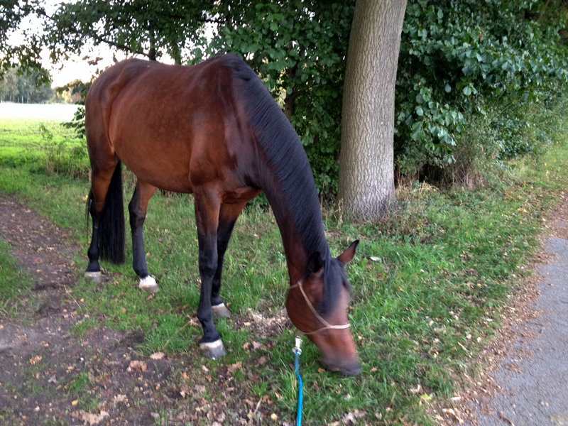 Galdina war heute ruhig und da wir langsam wieder mit der Arbeit beginnen dürfen, habe ich heute versucht mit ihr an der Hand zu traben. Beim ersten Versuch wollte sie lostürmen und hat übermütig mit dem Kopf geschlagen. Daraufhin bin ich sofort wieder Schritt gegangen. Man konnte sehen, wie sie überlegt hat und anschließend kaute. Nach wenigen Schritten habe ich es wieder versucht und siehe da Dina trabte ruhig und gelassen am durchhängenden Strick in meinem Tempo. 🙂 Da mir die Puste ausging, gingen wir wieder Schritt und danach sind wir noch einmal ein kurzes Stück getrabt. Insgesamt war es toll sie friedlich neben mir zu erleben. Wir werden das eine Weile so weiter handhaben, dann muss ich nicht in den Sand, den wir noch etwas meiden sollen.