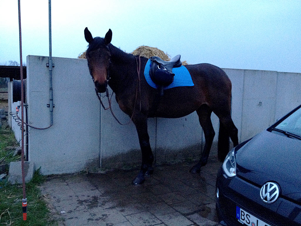 Wow, ich habe gerade mal nachgesehen, wann Galdina und ich das letzte Mal zusammen ausgeritten sind: am 06.06.2013! Die Beine sind heute deutlich kühl und bis auf das hintere rechte Bein sind auch alle wieder normal. Beim rechten Hinterbein bin ich mir inzwischen nicht mehr sicher, ob es nicht „normal“ dick ist, nach unserem Unfall vor zwei Jahren… Dina war auf dem Ritt deutlich aufmerksamer als an der Hand. Aber insgesamt konnte ich, bis auf ein kleines Stück mit ungewolltem Trab, am komplett hingegebenen Zügel durchs Gelände spazieren. 🙂 Hat Spass gemacht und war zu schnell wieder vorbei. Im Anschluss habe ich wieder die Beine heruntergekühlt.
