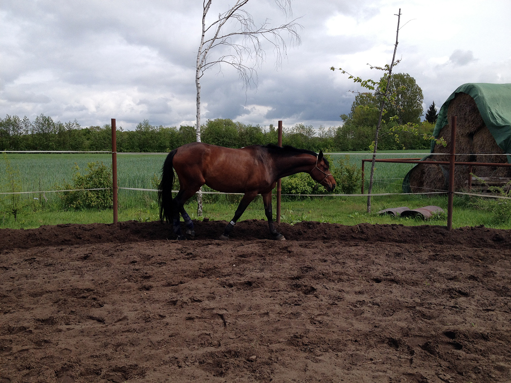 Schritt, Trab und Galopp mit kurzem Bodenseil und Knotenhalfter im Round Pen