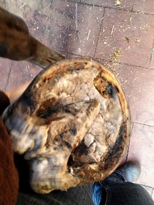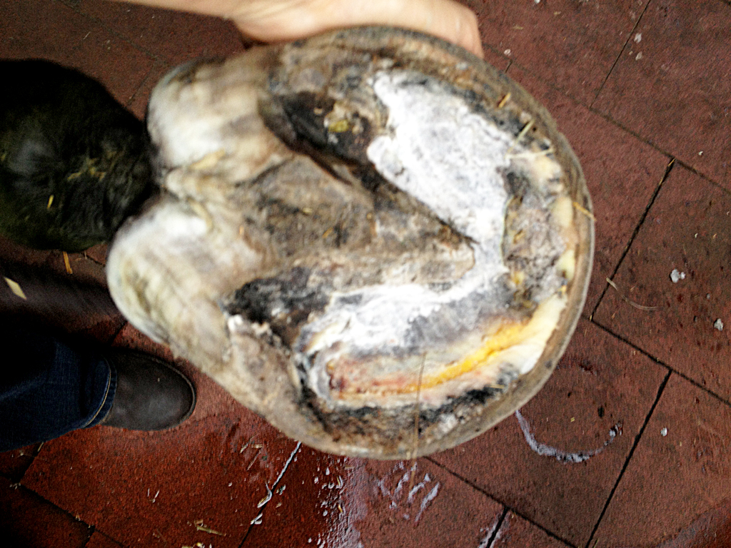 Es ist noch nicht einmal sicher, ob Galdina wieder wird richtig laufen können. 🙁 Zusammen mit Tierarzt und Schmied wurde der Angußverband entfernt. Mit der Zange wurde auf Druckempfindlichkeit getestet – Dina reagiert an der Sohle auf der äußeren Seite und an der Zehe. Daraufhin wurde das lose Horn entfernt. Sichtbar wurde neben dem infizierten Horn an der Zehe auch ein Bluterguß (siehe Bild). Normalerweise müßte das Horn der Sohle komplett entfernt werden, allerdings ist die Sohle schon jetzt viel zu dünn und das Hufbein droht durchzustossen.
