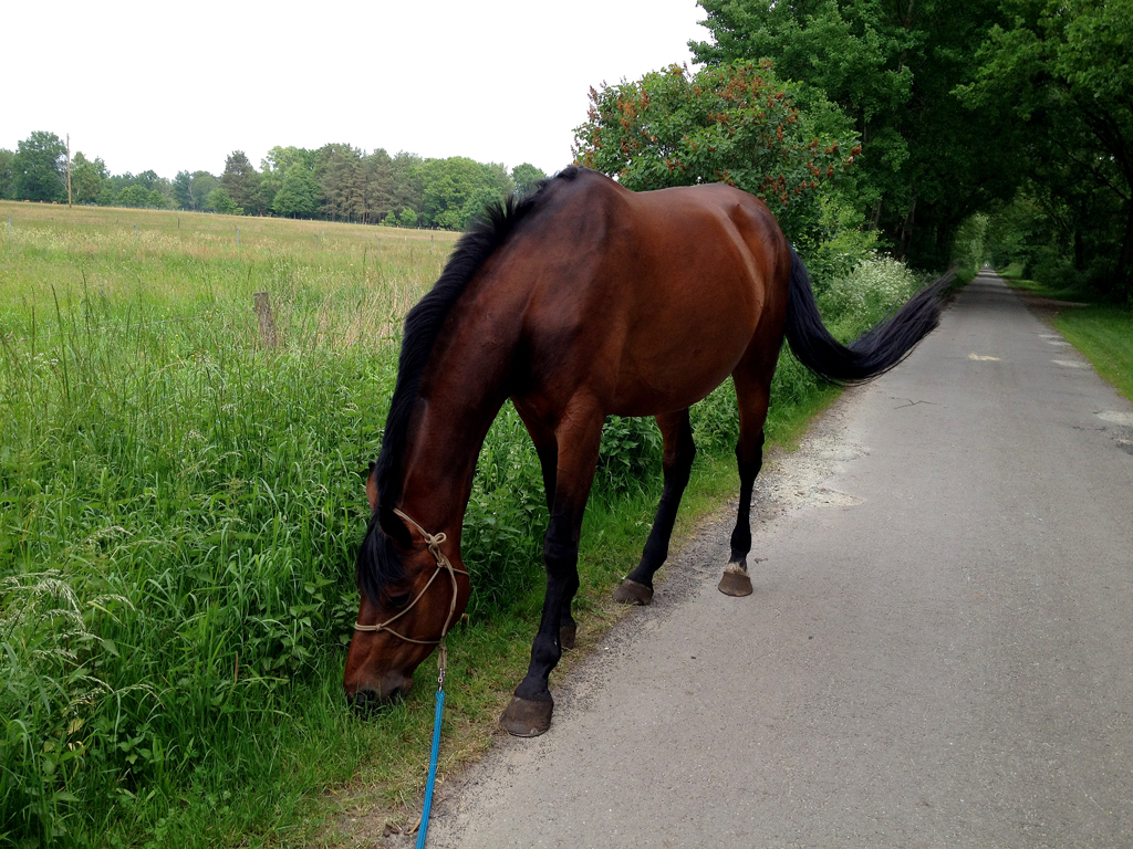 Da es heute wieder recht voll war, ich nicht die rechte Meinung zum Trainieren hatte und Galdina auch mal Ruhe haben konnte, beschloss ich nur einen kleinen Spaziergang mit viel Grasen zu machen. Die Belästigung durch Fliegen hielt sich in Grenzen, aber es gab massenhaft stechwütige Mücken.
