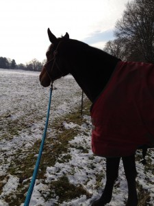 Galdina und ich sind gemütlich an der Hand mit Knotenhalfter und Bodenseil ins Gelände gegangen. Galdina ist irgendwie zwar nervös, aber wenn ich etwas von ihr fordere, dann scheint die Energie zu fehlen. 🙁 Sie war aber beherrschbar und lieb.