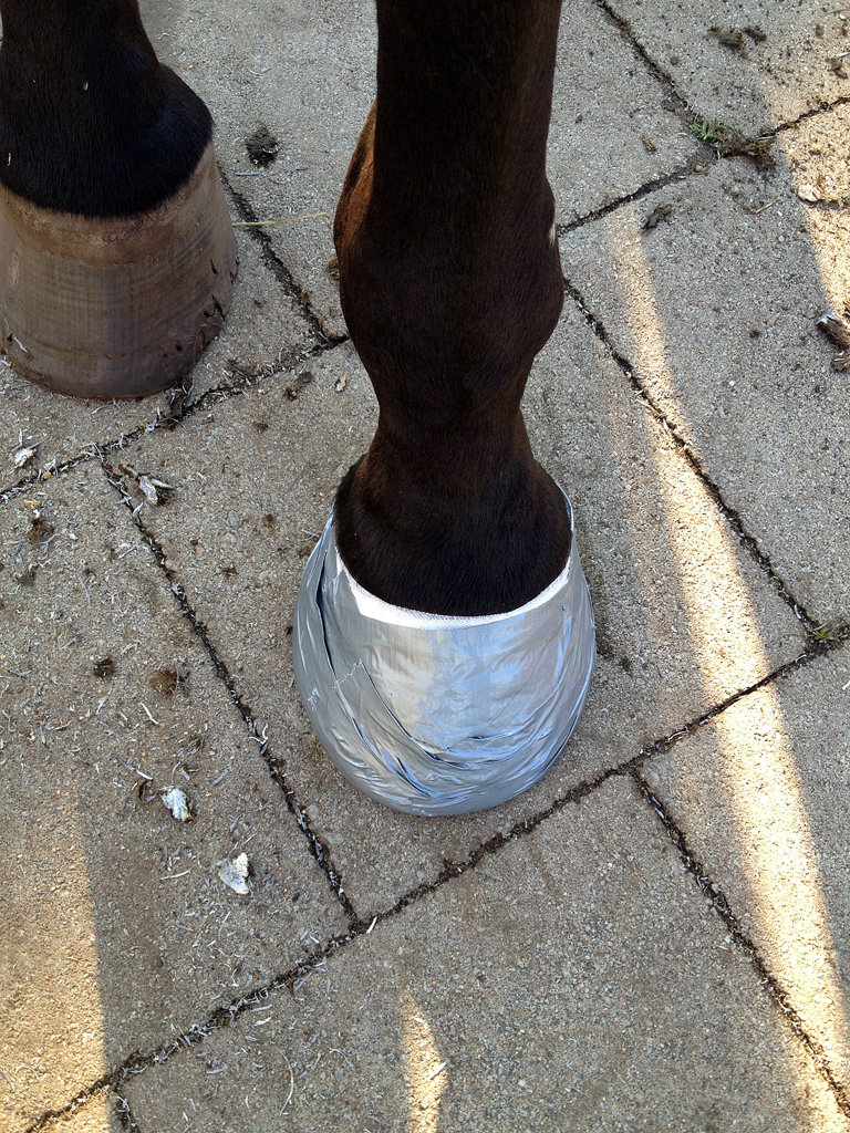 Wir haben Galdina in die Klinik gebracht. Die Ereignisse haben sich im Laufe des Tages überschlagen… Heute war Termin beim Schmied, daher habe ich Markus gebeten nur die Eisen abzunehmen, nachdem klar war, dass Dina in die Klinik kommt. Dabei ist ihm aufgefallen, dass Dina eine kreisrunde, tiefergehende Wunde/Öffnung in der Sohle links vorn im Huf hat. 🙁 Der Verdacht eines Abszesses lag nahe. Nach vielen hin- und herüberlegen haben wir die Wunde nicht am Stall geöffnet, sondern nur gepolstert und sind damit in die Klinik gefahren. Dort wurde die Wunde eröffnet und der Verdacht hat sich bestätigt: es ist ein Abszess! Und nicht wie üblich nur punktuell, sondern großflächig über die gesamte Sohle. 🙁 Danach gab es einen Verband und die Wunde wurde mit Wasser angegossen, da dass Horn zu hart war/ist. Morgen wird dann die eigentliche Behandlung beginnen: Wunde komplett aufmachen und säubern, Schulter röntgen und gegebenenfalls mit Utraschall untersuchen.