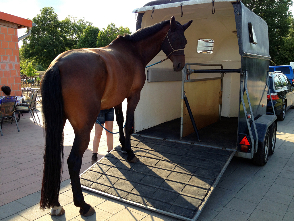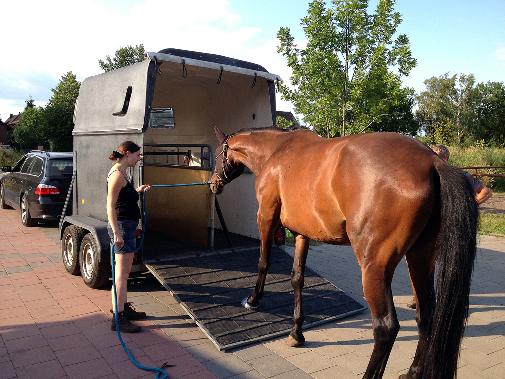 Ach ja und wir haben uns einen Pferdeanhänger geliehen der groß genug für Dina ist. War gar nicht einfach, da alle irgendwie zu klein oder verborgt waren. Dementsprechend vorsichtig ging Dina mit dem Hänger um. Die „übliche“ Vergehensweise hat nicht ganz so gut geklappt bzw. hätte einfach zu lang gedauert, also haben wir sie mit Heu überredet in den Anhänger zu gehen. Hat mir nicht gefallen, musste aber sein, da wir einen Termin hatten und in der Klinik auf uns gewartet wurde. Am Anfang hat Galdina dann echt Terror gemacht, so dass ich Angst um den Anhänger bekam. Aber nachdem wir dann fuhren, wurde sie ruhig und hat auch in den Kurven immer besser gestanden. *braves Pferd*