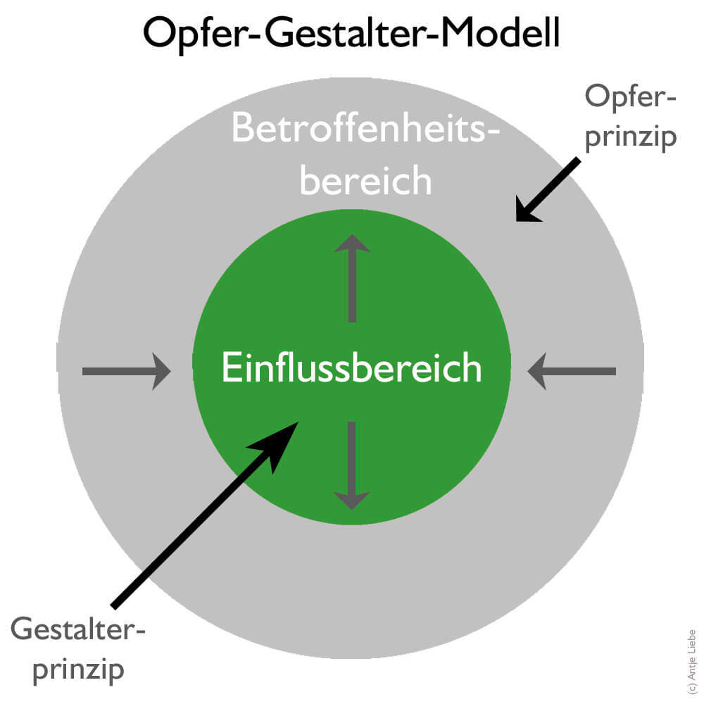 Lesezeit: 2 MinutenDas Opfer-Gestalter-Modell geht auf den Amerikaner Stephen R. Covey zurück. Es besagt, dass alle Ereignisse die um uns herum geschehen in zwei Bereiche zu unterscheiden sind: den Betroffenheitsbereich den Einflussbereich Betroffenheitsbereich In...
