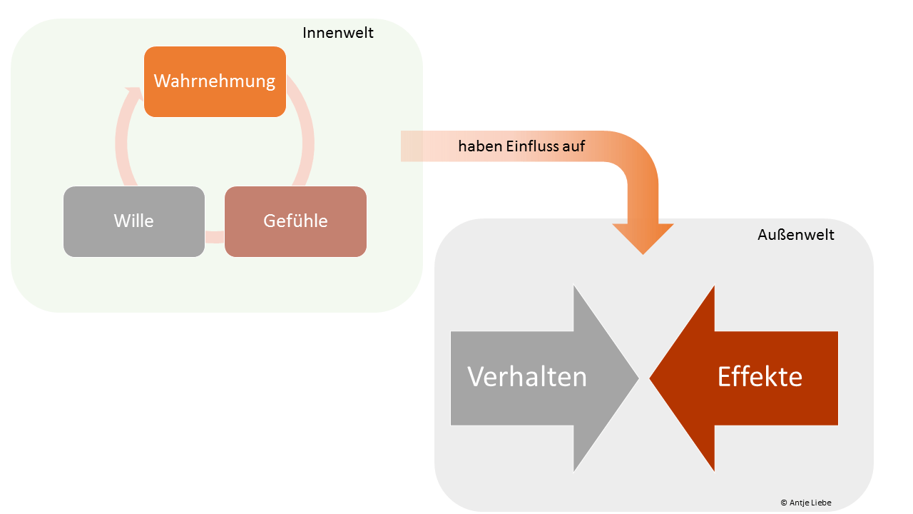 Wille, Wahrnehmung und Gefühle rufen natürlich auch weitere Effekte hervor. So wirkt es sich im Modell der Konfliktdynamik zum Beispiel auf die Innenwelt der sich äußernden Person, aber auch auf die Außenwelt der beteiligten Personen aus.