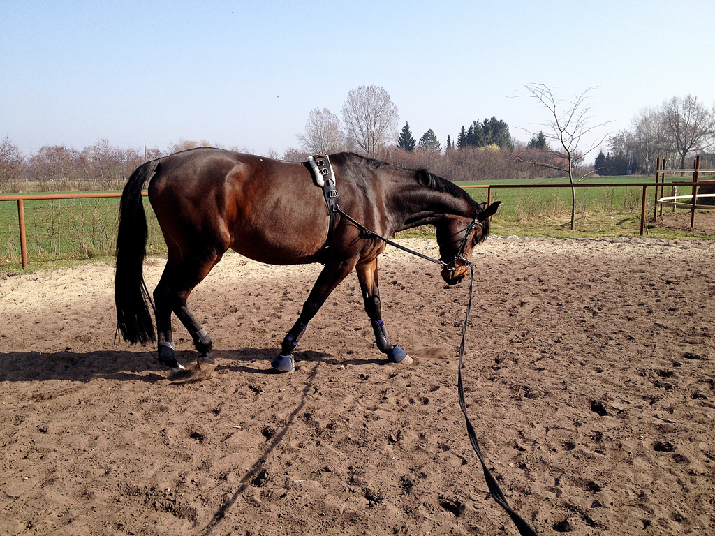 Schritt,Trab, Galopp auf dem Aussenplatz mit Kappzaum, Ausbinder und Longiergurt