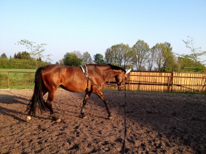 Heute ging es zum Longieren mit Kappzaum, Ausbindern und Longiergurt auf den Aussenplatz. Leider ist am rechten Vorderhuf innen etwas Hufhorn weggebrochen, so dass ein Nagel kein Halt mehr hat. Mal sehen ob das Eisen hält.