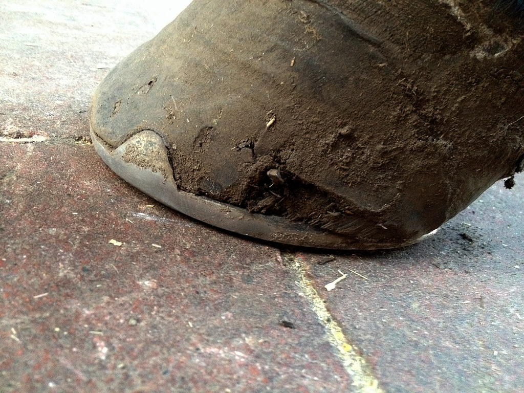 Innen am Huf etwas weggebrochen, so dass ein Nagel kein Halt mehr hat.