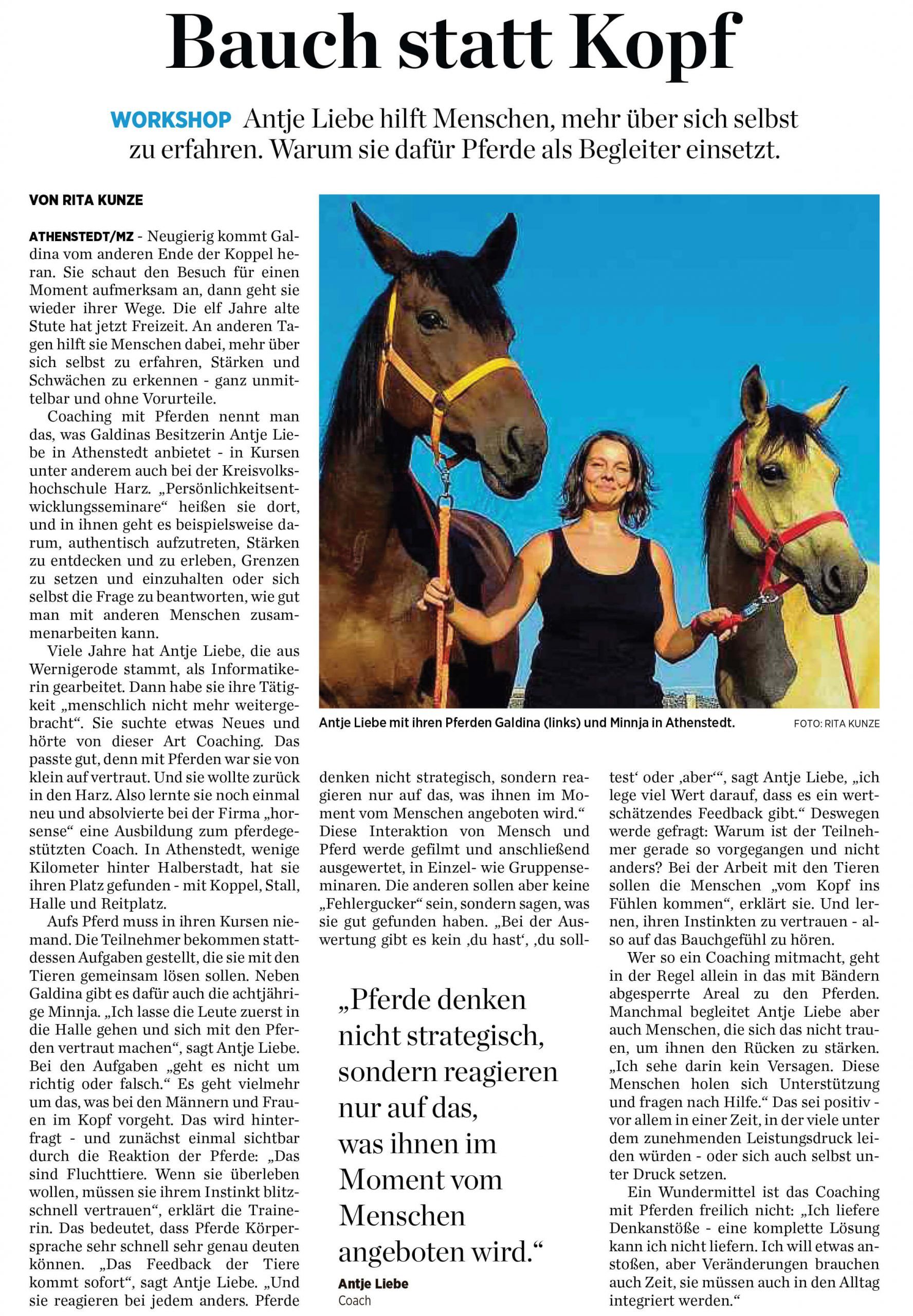 Antje Liebe wohnt und arbeitet in einem kleinen Dorf im Harz – zusammen mit ihren zwei Pferden. Sie berät und coacht Unternehmen und Privatpersonen zu den Themen Onlineauftritt, Analysen der Unternehmungen, Gesundheitsvorsorge, Stressbewältigung und Burnout-Prävention, Motivation, Persönlichkeits- und Teamentwicklung. Je nach Thema als Einzel- oder Gruppen- oder Teamveranstaltungen – inhouse, extern oder vor Ort mit Pferden.
