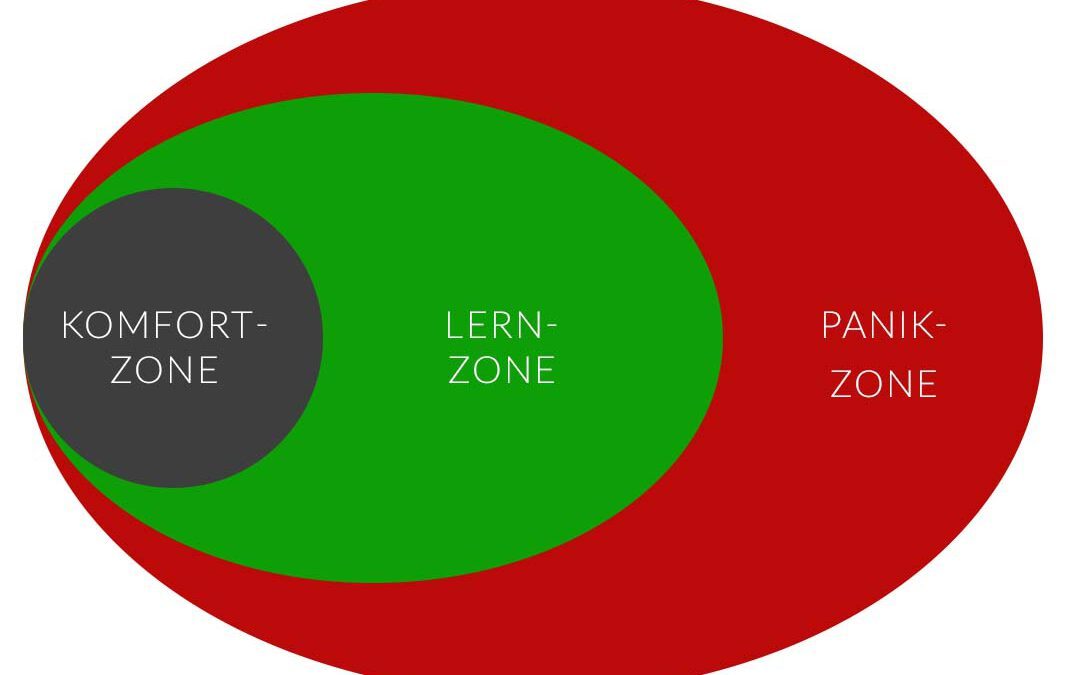 Ein Rückzug ist vollkommen in Ordnung, denn hier in dieser Zone geht es uns nicht gut. Wichtig ist, dass Sie nicht immer direkt wieder in Ihre Komfortzone springen, sondern kleine Schritte zurück in die Lernzone machen. Andernfalls besteht die im Abschnitt „Komfortzone“ genannte Gefahr, dass die Lernzone zu sehr schrumpft und ich mich selbst handlungsunfähig mache.