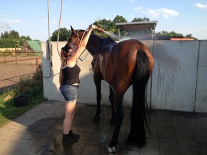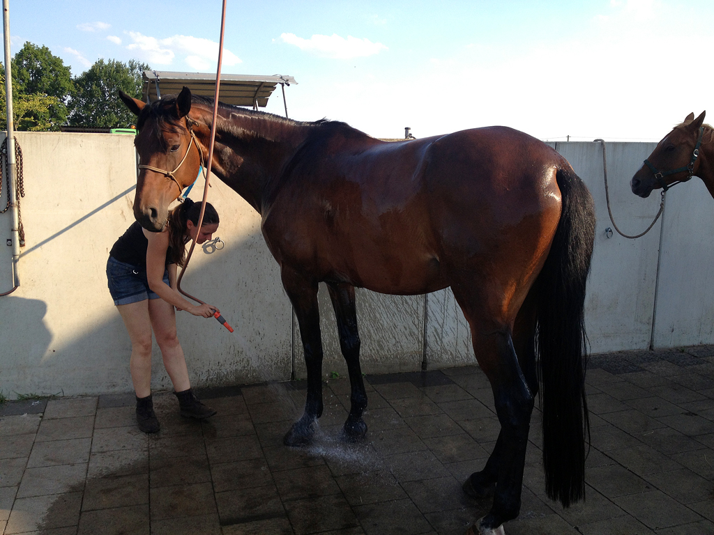 Heute geht Galdina natürlich nicht mehr lahm – jedenfalls nicht im Schritt. :-/ Typisch der Tierarzt kommt ja auch. Das Dina im Schritt gelahmt hat, sein nicht gut, aber heute sei davon nichts zu sehen. Das Galdina im Trab noch lahmt ist aber völlig in Ordnung. Insgesamt wirkte der Tierarzt zufrieden. Aber sicherheitshalber habe ich Antibiotika für den Huf und Schmerzmittel bekommen. Anschließend wurde geduscht und danach ging es zurück auf die Wiese.