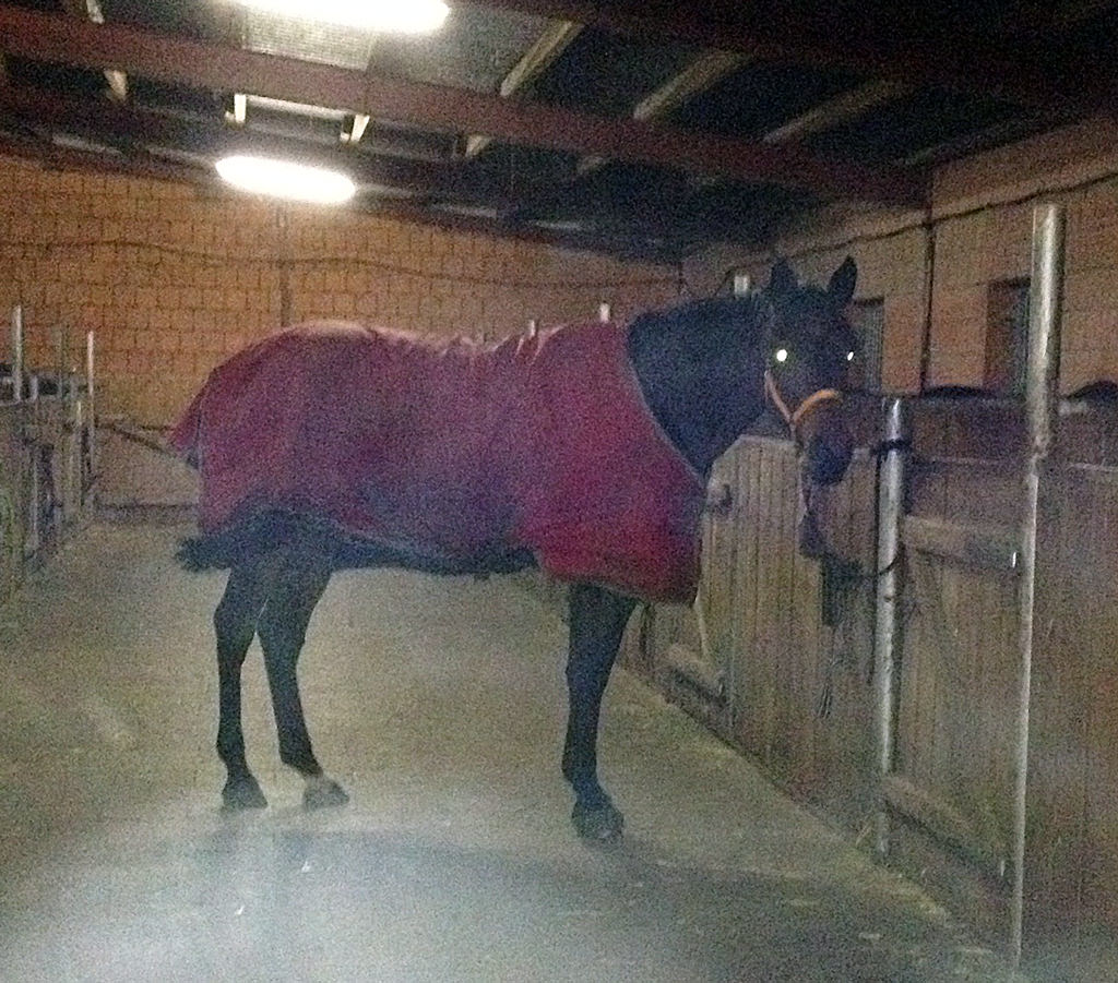 Galdina ging es heute irgendwie nicht gut. Sie frass nicht, stand ziemlich apathisch in der Box und schaute in die Stallgasse. 🙁 Das Heu in ihrer Box war total verstreut und es gab auch keine Pferdeäppel… Kolik?! Darmgeräusche waren zu hören, geschwitzt hat sie auch nicht und auch nicht zum Bauch gezeigt oder getreten. Ich habe Din aus der Box geholt und zunächst die Decken gerichtet und die Stallgamaschen abgemacht, währenddessen wurde das Wasser schon warm. Auch in der Stallgasse war Dina ungewöhnlich ruhig. Ich habe mich dann noch bei den Stallbetreibern erkundigt ob tagsüber etwas vorgefallen war, aber das war nicht so, bis auf dass die Unterdecke kaputt gerissen ist. :-/ Im Anschluß habe ich draußen den alten Verband abgewaschen, drinnen den neuen angelegt und die Box in Ordnung gebracht. Außerdem habe ich um Nachricht gebeten, wenn Dina am Morgen immer noch nicht geäppelt hat.