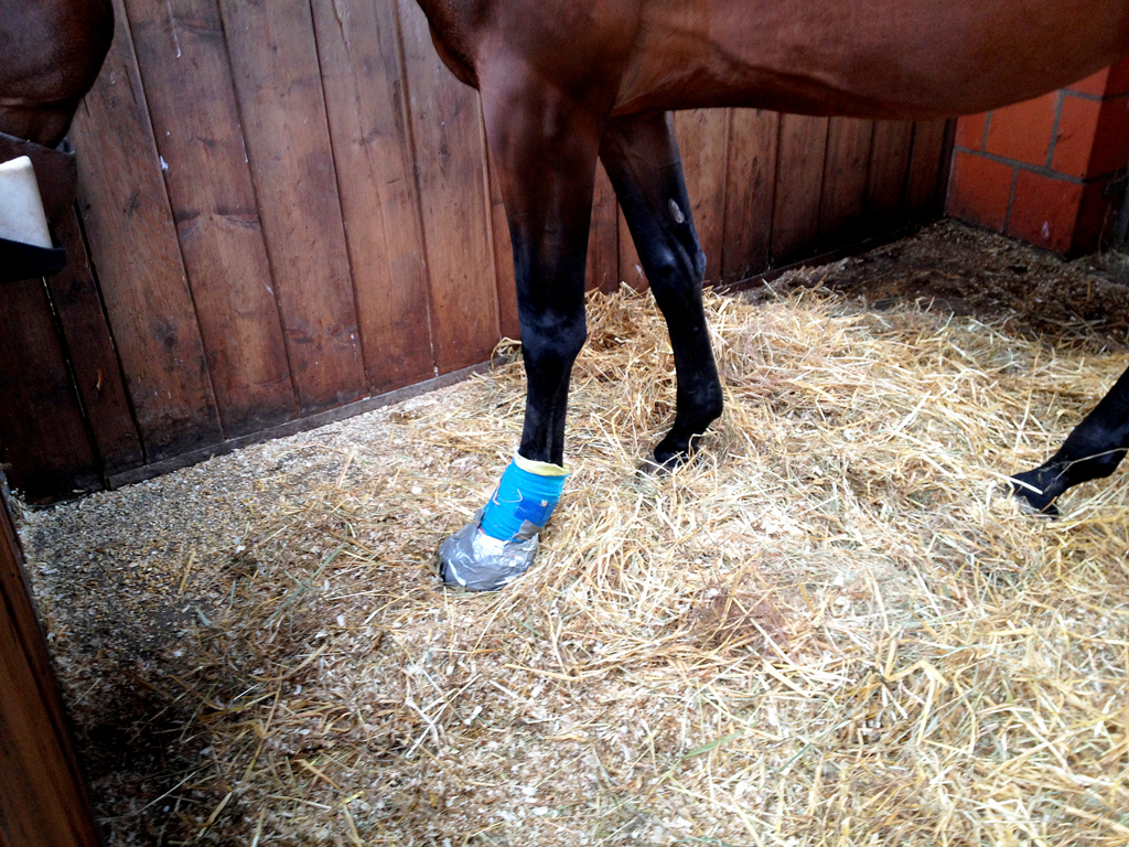 Wie befürchtet hat der Verband die Nacht nicht überstanden. Galdina läuft Kilometer in ihrer Box und kratzt und schart, besonders wenn ihr Begleitpferd aus der Box geht. 🙁 Ich habe den Verand dann erneuert, mit noch mehr Schichten Panzerband versehen und eine Bandage darüber gemacht, damit Dina nicht knabbern kann.
