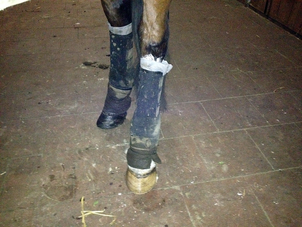 Es ist ziemlich kalt geworden. Also habe ich das Wasser gekocht und die alte Tonerde damit abgewaschen. Galdina steht super ruhig und lässt alles mit sich geschehen. Danach habe ich ein Bein (links) wieder mit Tonerde einrieben und das andere mit Pferdesalbe. Die Beine sind nur noch leicht warm und gar nicht mehr dick. Ich werde den Verband bis zum Wochenende durchziehen und mir dann ansehen wie Dina läuft. Sie ist nämlich nicht besonders erfreut darüber „nichts“ mehr zu tun…