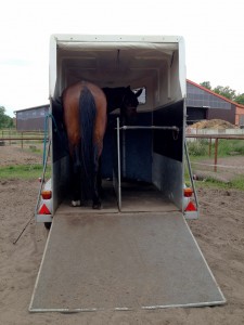 - Galdina ging mit beiden Vorderhuf willig auf die Rampe und mit leichtem Seilschwingen ging sie leicht stockend bis in den Anhänger