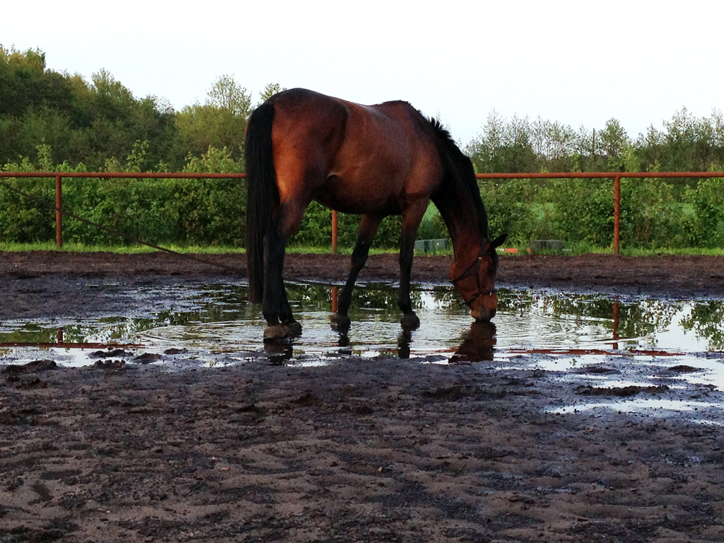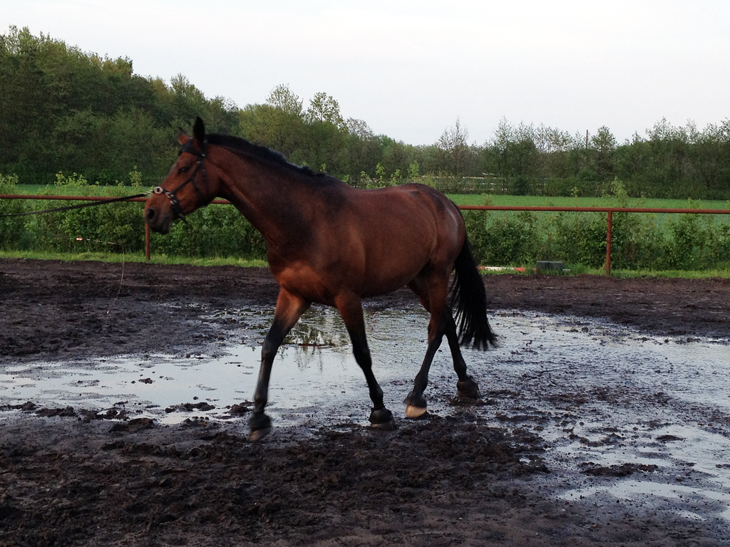 Am Anfang ist Galdina vorsichtig ins Wasser gegangen. Dann hielt sie an und trank sich erst einmal satt. 😉 Im Wasser hat Galdina die Hinterhand schön aktiv bewegt, daher habe ich die Einheit nicht lang ausgedehnt, da es sehr anstrengend war.