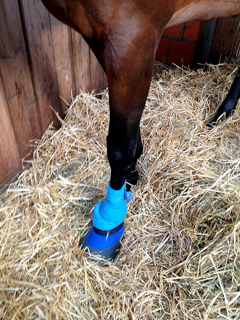 Der Krankenschuh hält, auch wenn er schon an einigen Stellen an Farbe eingebüßt hat. 😉 Ansonsten habe ich das Gefühl das Galdina langsam ruhiger wird. Leider nimmt sie nach wie vor ab und auch das Fell wird immer stumpfer. Zum Angießen gehe ich inzwischen an den Schlauch, da Dina dort ruhig steht und ich den Verband nass machen kann.